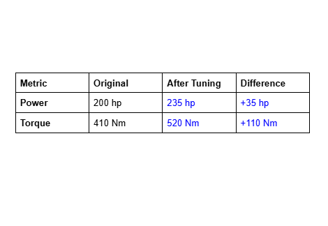 - Measured Gains: +35 hp / +110 Nm (200 → 235 hp, 410 → 520 Nm)