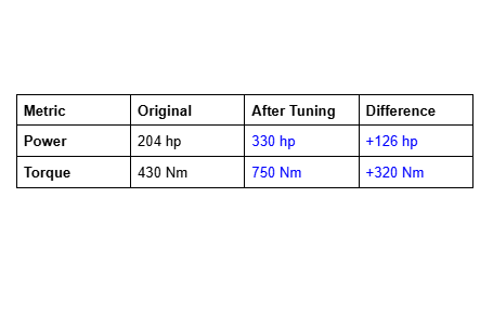 - Measured Gains: +126 hp / +320 Nm (204 → 330 hp, 430 → 750 Nm)